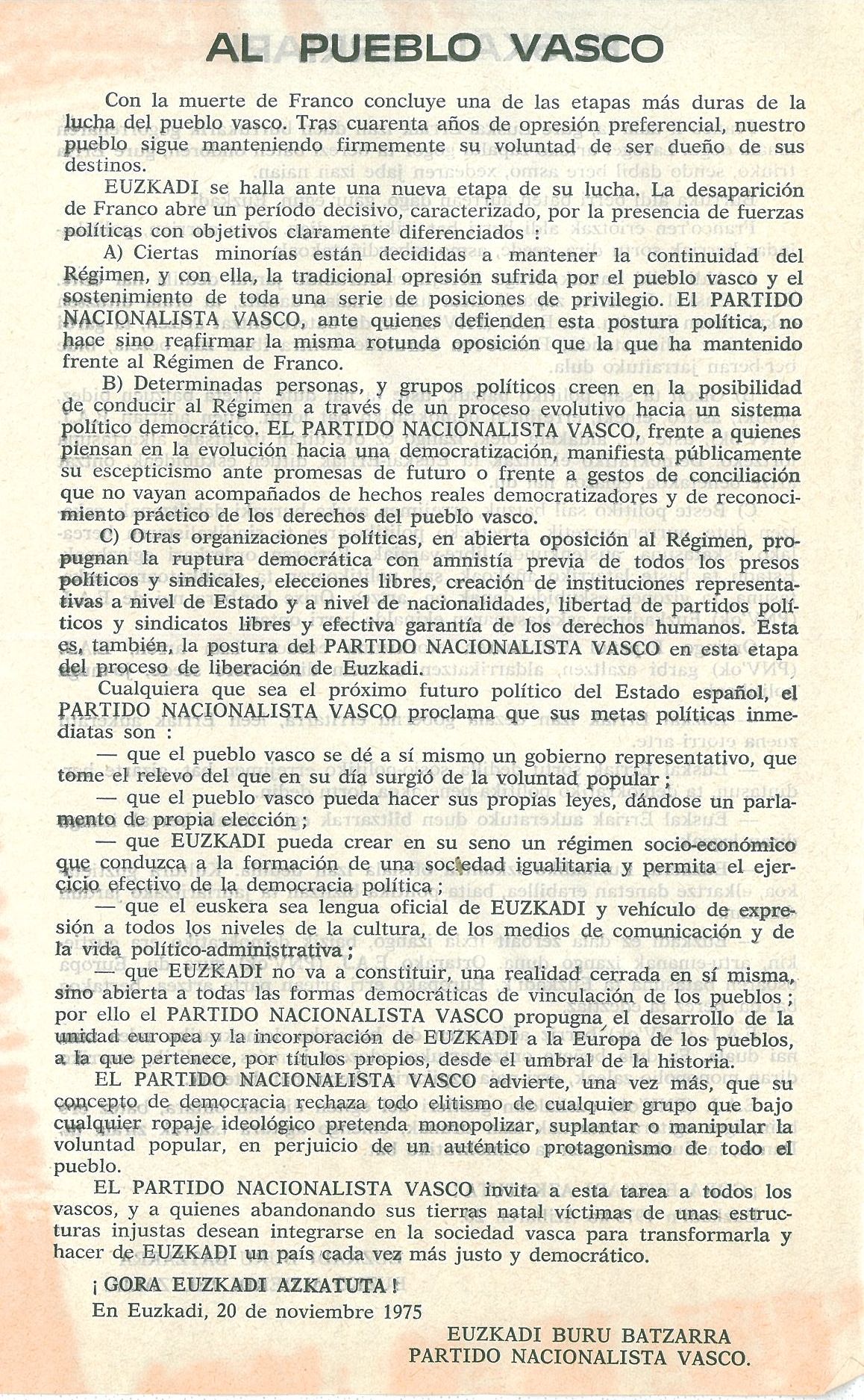 Documento del EBB tras la muerte de Franco