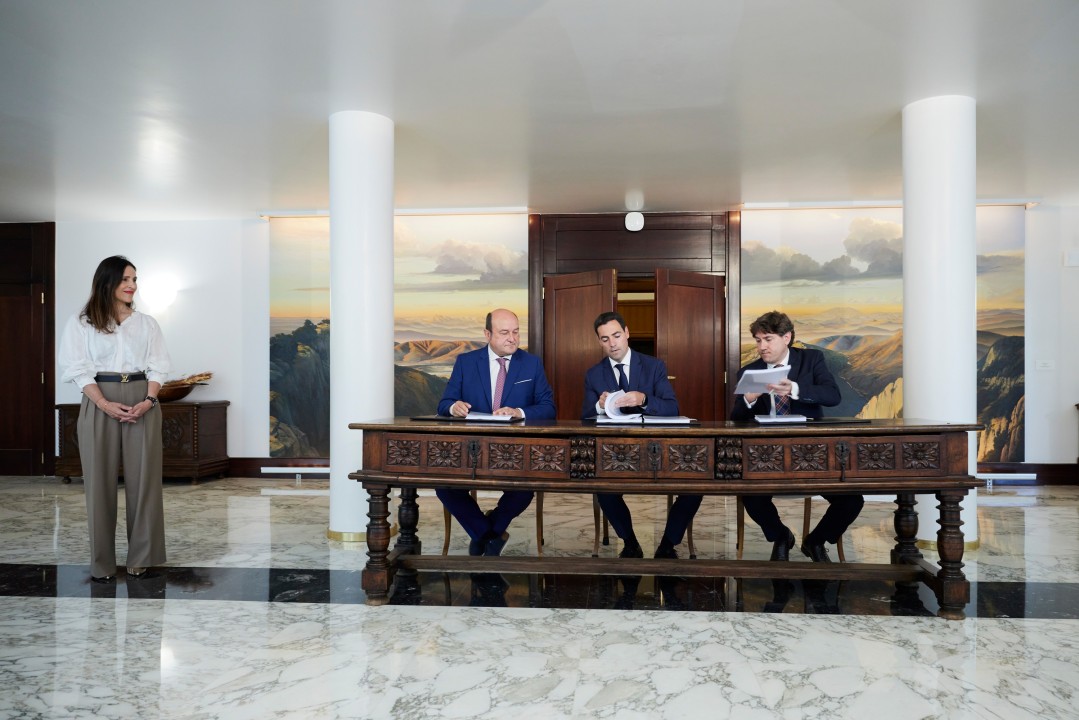 Firma acuerdo de coalición EAJ-PNV-PSE-EE. Andoni Ortuzar, Imanol Pradales, Eneko Andueza 19Junio