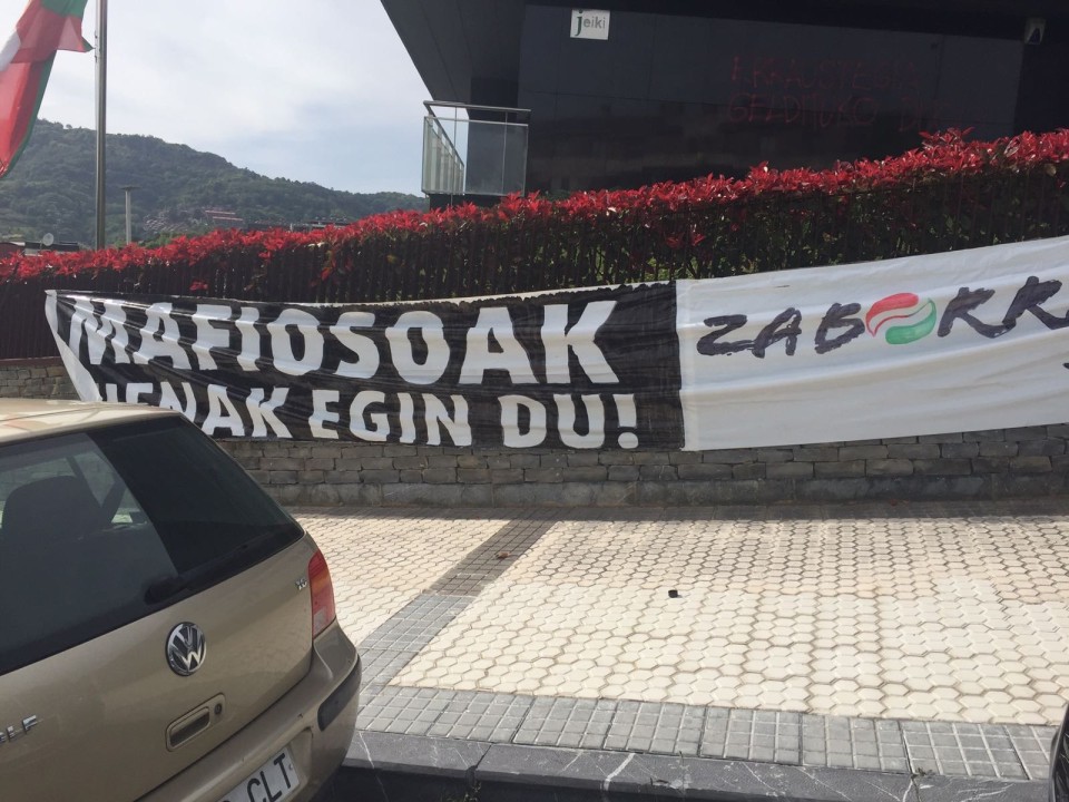 08MayoEsta tarde un grupo de ocho jóvenes ha lanzado basura y ha realizado pintadas -en nombre de Ernai- en la sede del Gipuzko Buru Batzar en Donosti. Asimismo los jóvenes –que ocultaban sus rostros con máscaras- han colgado en la verja del GBB una pancarta en la que se leía “Mafiosoak, zuenak egin du. Zaborra zarete!!!” firmada por Ernai. Las pintadas que han dejado en las paredes del edificio eran en contra de la incineradora (“Erraustegia geldituko dugu!”) .