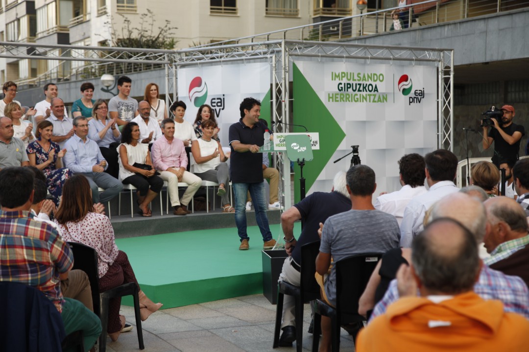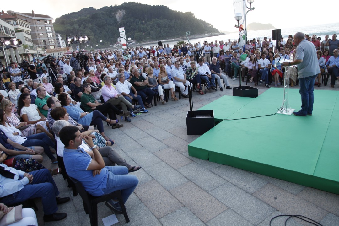 Este ha sido el principal mensaje que Andoni Ortuzar, presidente del Euzkadi Buru Batzar, ha lanzado hoy a las cerca de 500 personas que han asistido en el Malecón de Zarautz al tradicional acto político con el que EAJ-PNV ha dado inicio al curso político. Un mitin en el que también han intervenido Joseba Egibar, presidente del Gipuzko Buru Batzar; Xabier Txurruka, alcalde del municipio costero, y Jokin Landa, presidente de la Junta Municipal de Zarautz. El EBB al completo, con Mireia Zarate, Joseba Aurrekoetxea, Koldo Mediavilla, Kepa Aldama, María Eugenia Arrizabalaga, Mikel Burzako, Ana Esther Furundarena, Iñaki Txueka, y los máximos representantes territoriales José Antonio Suso (ABB), Itxaso Atutxa (BBB), Paco Arizmendi (IBB) y Unai Uhalde (NBB), ha asistido al acto. Asimismo, también han acudido los diputados generales de Bizkaia y Gipuzkoa, Unai Rementeria y Markel Olano, respectivamente; el portavoz jeltzale en el Congreso, Aitor Esteban; el portavoz del grupo vasco en el Senado, Jokin Bildarratz; la presidenta del Parlamento Vasco, Bakartxo Tejeria; la presidenta de las Juntas Generales de Gipuzkoa, Eider Mendoza; la eurodiputada, Izaskun Bilbao, y los consejeros Arantxa Tapia, Bingen Zupiria, Beatriz Artolazabal, Jon Darpón, Cristina Uriarte y Estefanía Beltrán de Heredia, así como numerosos cargos públicos e internos de EAJ-PNV. También han asistido al acto el presidente del PDeCAT, David Bonvehí, y la vicepresicenta de la formación catalana, Miriam Nogueras, a quienes Ortuzar ha tributado una cálida bienvenida. “Benvinguts a casa vostra. Ongi etorriak zuen etxera. El año pasado nos acompañó aquí en Zarautz Jordi Turull, hoy injustamente preso. Le mandamos también a él, y a todos los presos y presas por el ‘procés’, nuestro abrazo más caluroso y solidario. Y volvemos a pedir su inmediata puesta en libertad. La de todos y todas”, ha afirmado el líder jeltzale.