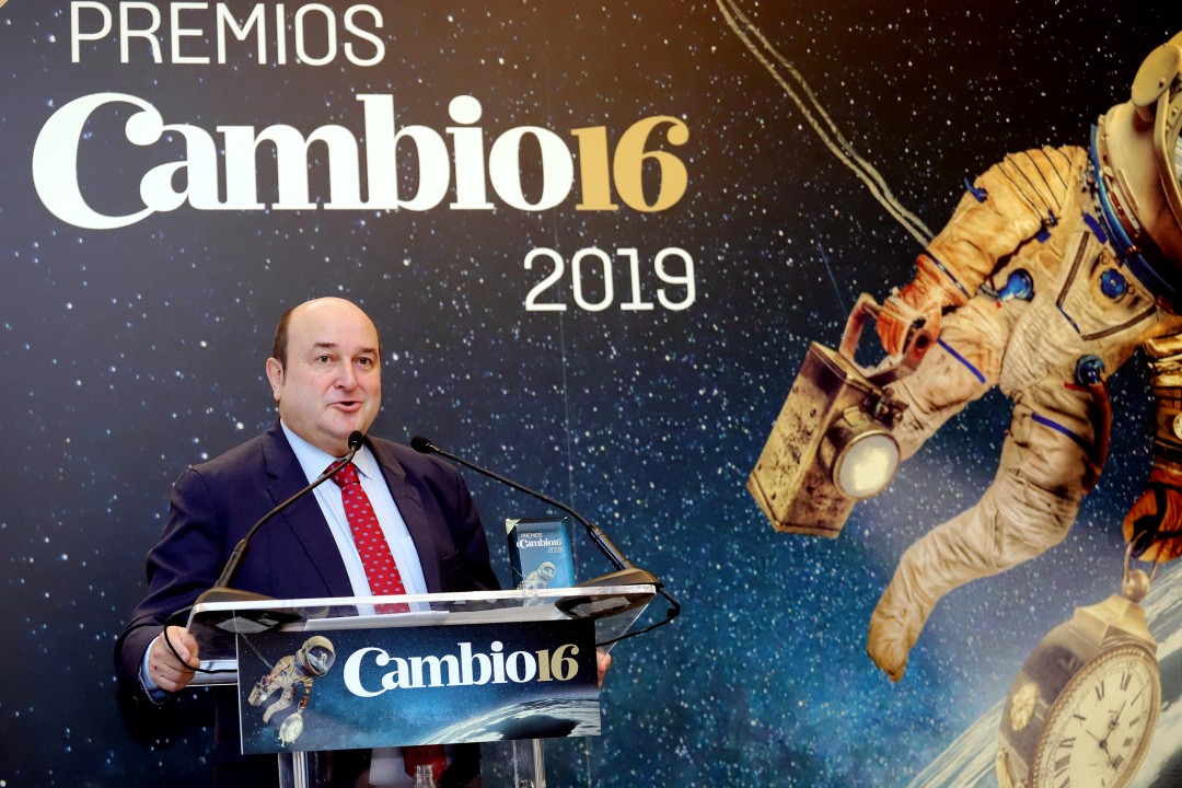 “Es un honor recibir este premio de Cambio16 en nombre de todo EAJ-PNV, un partido que cumplirá 125 años el próximo 31 de julio y que lleva 101 años haciendo política en Madrid con una seña de identidad: la búsqueda del diálogo y del acuerdo”. Con estas palabras ha iniciado Andoni Ortuzar, presidente del Euzkadi Buru Batzar, el discurso que ha pronunciado en el Hotel Palace de Madrid tras recibir de manos de Gorka Landaburu el Premio Cambio16 2019 en la categoría política. Un galardón que, en palabras del propio Landaburu, la publicación que dirige ha otorgado a la formación jeltzale porque “en este gallinero en que se ha convertido la política en España, el PNV ha sabido mantener la moderación, la centralidad y la mesura que le han caracterizado siempre en la búsqueda del acuerdo y del pacto. En breve cumplirá 125 años, es el segundo partido más longevo del Estado, y siempre ha defendido la democracia, la libertad y los Derechos Humanos sin renunciar a sus principios e ideales”. Entre los galardonados se encontraban el alcalde de Vitoria-Gasteiz, el jeltzale Gorka Urtaran, distinguido en la categoría de Ciudad, el presentador Pablo Motos o el tenista Rafa Nadal.