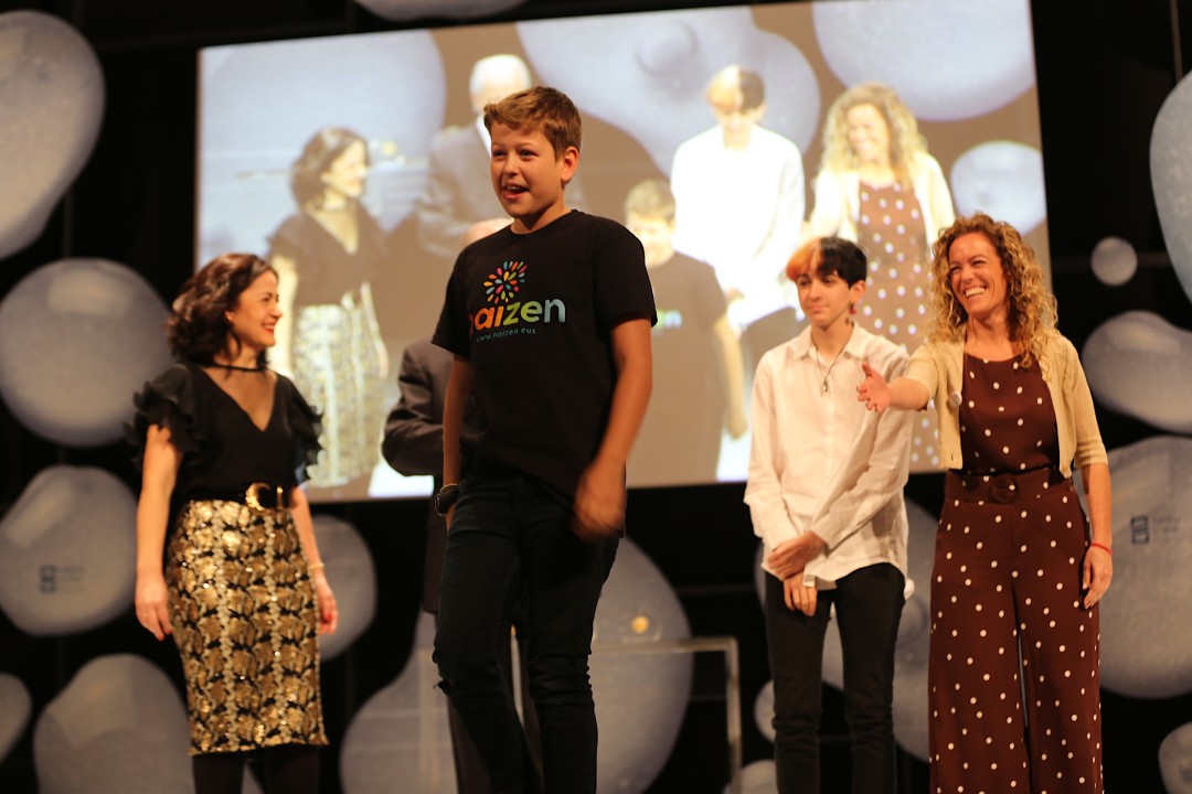 A continuación, Ian, Naroa e Izar, junto a sus padres, y la portavoz de la Asociación de familias de menores transexuales, Naizen, Bea Sever, han recibido el premio en nombre todos los niños, niñas, jóvenes y sus familias comprometidos con la diversidad sexual inclusiva y por hacer visible la realidad de los menores transexuales.