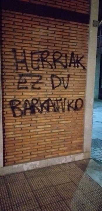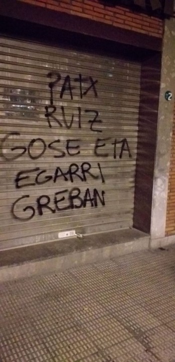 16MayoEl Bizkai Buru Batzar vuelve a condenar, por tercer día consecutivo, dos nuevos ataques a dos de sus sedes sociales. Sucedió en la noche de ayer en los establecimientos que EAJ-PNV tiene en Repélega (Portugalete) y Mungia donde desconocidos pintaron proclamas como'amnistia', ‘herriak ez du barkatuko’ y ‘Patxi Ruiz gose eta egarri greban’, en alusión a la huelga de ‘sed y hambre’ en que se encuentra el preso de ETA Patxi Ruiz. La sede de Podemos en esta localidad también ha sufrido un ataque similar. El BBB traslada su solidaridad y cercanía a la formación morada y su militancia.