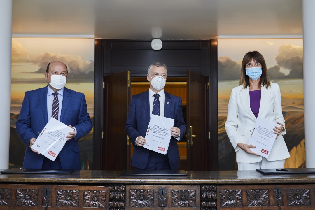 Según el dirigente nacionalista, EAJ-PNV y PSE-EE han querido definir en el acuerdo que hoy han firmado (y que se hará público el mismo jueves, día de la investidura, “por respeto al Parlamento”) las decisiones más apremiantes que debe abordar el próximo Gobierno sobre cuatro ejes vertebradores: lo urgente, lo importante, lo responsable y lo pendiente. “Lo urgente es la Prosperidad: desarrollar una estrategia que apueste por la recuperación del empleo, la mejora de la calidad del mismo y la reactivación económica para superar los efectos negativos de la pandemia de la Covid-19. Lo importante son las Personas: son el elemento fundamental del compromiso político de la acción del nuevo Gobierno. Nuestro compromiso es consolidar y reforzar los servicios públicos de salud y educación y garantizar todas las políticas sociales que contribuyan al desarrollo humano de la sociedad vasca. Lo responsable es el Planeta: la sociedad vasca debe aportar su contribución para lograr la recuperación del equilibrio del planeta. Manifestamos nuestro compromiso con una transición energética y climática justa, la apuesta por las energías renovables, la conservación del medio natural y la biodiversidad y el impulso de la economía circular. Y lo pendiente es la Convivencia, el Autogobierno y los Derechos Humanos: remarcamos la necesidad de seguir trabajando en la tarea pendiente de consolidar la convivencia, la justicia y la seguridad de las personas; defender los Derechos Humanos; así como defender el Autogobierno y el cumplimiento íntegro del Estatuto de Gernika y lograr un nuevo pacto estatutario para una nueva generación”.