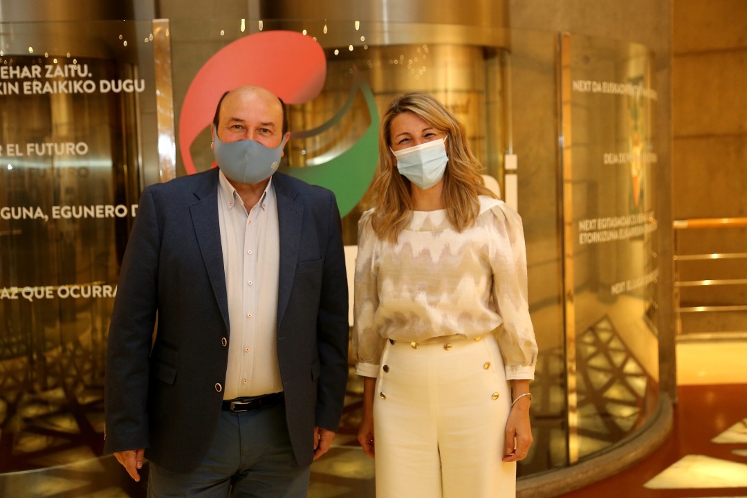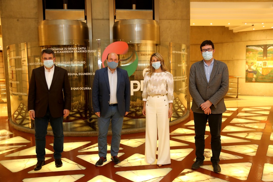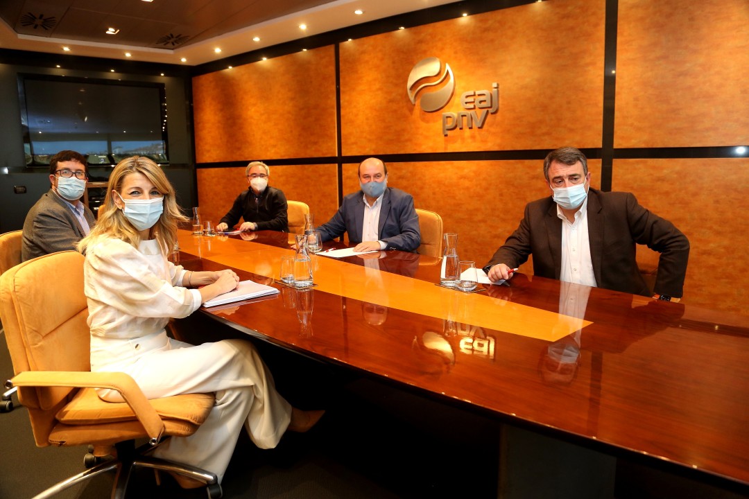 El presidente del EBB, el burukide Joseba Aurrekoetxea y el portavoz del Grupo Vasco en el Congreso, Aitor Esteban, han departido durante más de dos horas con la vicepresidenta tercera del Gobierno español y ministra de Trabajo y Economía Social y con el secretario de Estado de Empleo y Economía Social, Joaquín Pérez Rey