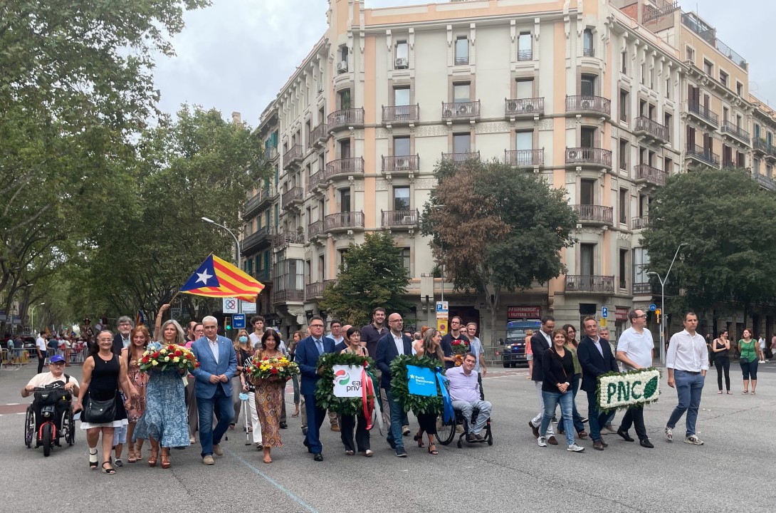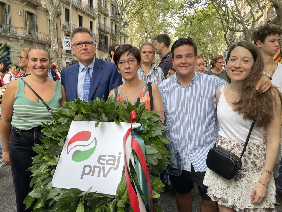 “Un año más, hemos venido un 11 de septiembre hasta Barcelona para, en nuestra condición de representantes del Pueblo Vasco, presentar nuestro respeto y mostrar nuestra solidaridad con el pueblo de Catalunya. También queremos, en un día tan señalado, sumarnos a la reivindicación de que Catalunya, como Euskadi, pueda decidir su futuro en libertad y democracia”. Con estas palabras ha comenzado su intervención ante los medios de comunicación la portavoz del Grupo Vasco en el Senado, Estefanía Beltrán de Heredia, en la ofrenda floral a Rafael Casanova, en Barcelona, con motivo de la Diada de Catalunya. Beltrán de Heredia e Imanol Landa, senador jeltzale y miembro de la Mesa de la Cámara Alta, han integrado la delegación de EAJ-PNV en este simbólico acto acompañados por los egikides Olatz Arrese, Aitor Iriondo y Amaia Larrañaga, y junto a una delegación del PDeCAT encabezada por su presidente, David Bonvehí, y su secretario de organización y diputado por Barcelona en el Congreso, Genís Boadella.