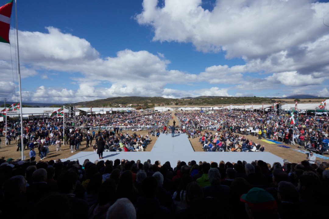 “Tanto en San Ignacio como en Zarautz, expresamos claramente nuestra posición ante el Gobierno de Pedro Sánchez, y hoy la reiteramos. Falta voluntad política. Faltan por cumplir muchos compromisos, el tiempo avanza y toca hacer frente a la palabra dada, como hacemos nosotras y nosotros cada vez que votamos en el Congreso y en el Senado. Y lo voy a dejar ahí, para que no se hagan más interpretaciones o elucubraciones. Como la política española está dividida en dos bloques irreconciliables, si levantas un poco la voz siempre hay alguien que escribe que ya te estás pasando al otro lado. Pues bien, que quede claro que el PNV solo tiene un lado: está por encima del río Ebro y se llama Euskadi. Ni Sánchez, ni Feijóo: Euskadi y solo Euskadi”. El presidente del Euzkadi Buru Batzar, Andoni Ortuzar, ha arrancado una atronadora ovación al lanzar este mensaje a los miles y a las miles de alderdikides y alderdizales que se han acercado hoy hasta Foronda, desafiando a la lluvia y al frío, para celebrar el 46º Alderdi Eguna. Una fiesta que en 2020 y 2021 se celebró en formato reducido debido a las restricciones por la pandemia pero que esta mañana ha recuperado su formato habitual, masivo y festivo. Ortuzar ha cerrado un acto político en el que también ha intervenido el Lehendakari, Iñigo Urkullu, y la EGIkide Bea Berlanga. En su alocución, Urkullu ha asegurado que Euskadi está preparada para hacer frente a los desafíos próximos gracias a la estrecha colaboración que el Gobierno Vasco mantiene con el conjunto de las instituciones vascas, fruto de la cual es la inmediata puesta en marcha de medidas para mitigar la subida de los precios de la alimentación y de la energía . “Saldremos adelante si trabajamos juntos y juntas”, ha afirmado el Lehendakari.