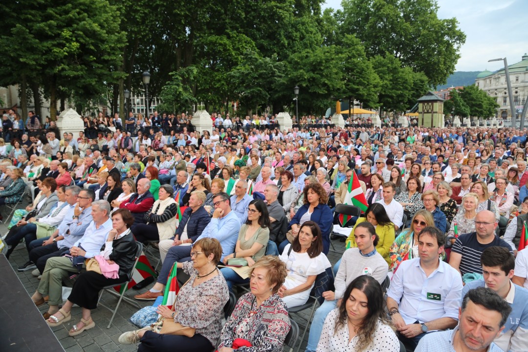“Dos llamamientos especiales. El primero, a las mujeres. Se cumplen cien años de Emakume Abertzale Batza. ¡Cuánto trabajo hicieron aquéllas para que las mujeres pudieran votar! Y ahora no sólo podéis votar: podéis decidir que Bizkaia y Gipuzkoa tengan las primeras mujeres diputadas generales, y Gasteiz su primera alcaldesa de la historia. Y otro mensaje para las jóvenes y los jóvenes: también hay que ir a votar, es la mejor manera de empoderaros y de construir desde ya esa sociedad que queréis y reclamáis. ¡A votar, todas y todos a votar! ¡Y a votar PNV!”. Con este doble mensaje ha concluido el presidente del Euzkadi Buru Batzar, Andoni Ortuzar, el acto con el que EAJ-PNV ha echado el cierre a la campaña de las Elecciones Municipales y Forales del 28 de mayo. Un mitin que la formación jeltzale ha celebrado en El Arenal bilbaíno ante cerca de 3.000 alderdikides y alderdizales, y en el que han intervenido, además de Ortuzar, el Lehendakari, Iñigo Urkullu, y las candidatas y los candidatos jeltzales a las Diputaciones Forales, Elixabete Etxanobe, Ramiro González y Eider Mendoza, y a las capitales de la CAV, Juan Mari Aburto, Beatriz Artolazabal y Eneko Goia.