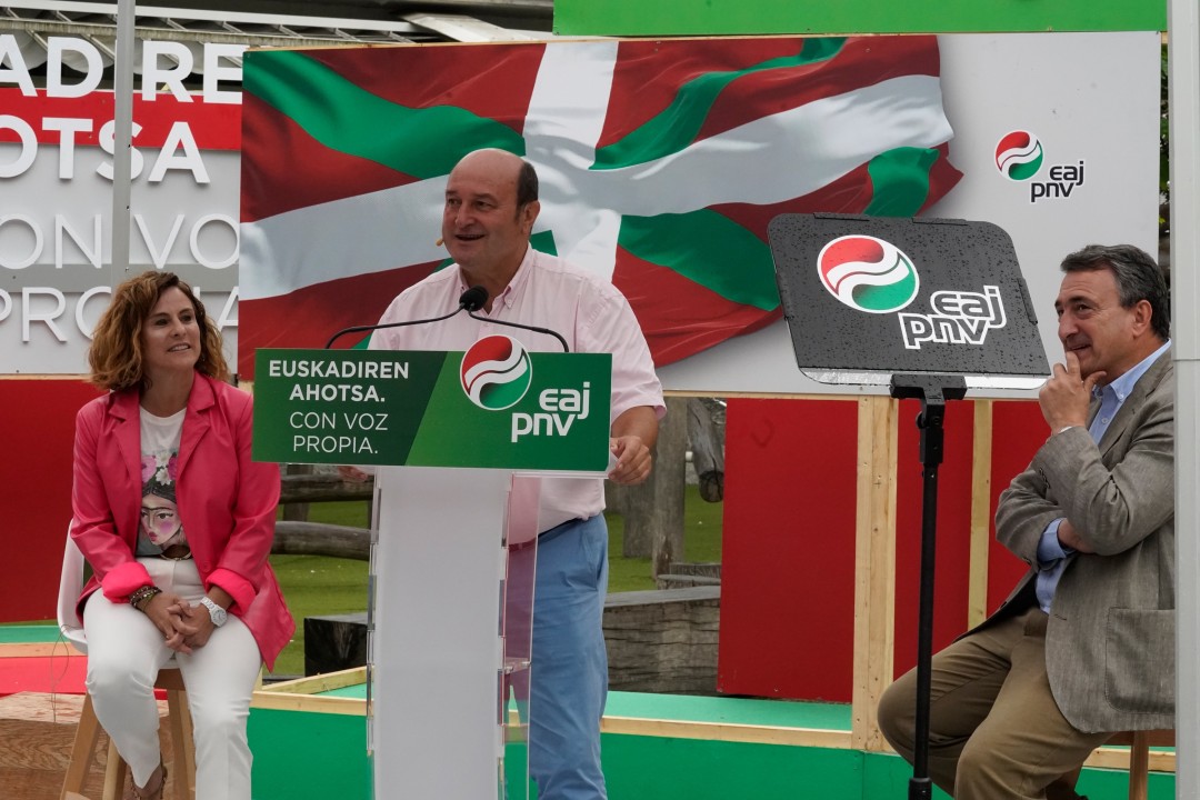“El otro día, Iturgaiz decía que votar al PNV era como votar a Sánchez. El mismo día, el candidato de Sumar decía que votar al PNV era como votar al PP. Ayer, Otegi nos afeaba supuestos pactos con el PP. Y, a renglón seguido, oíamos a Javier de Andrés lamentarse y rasgarse las vestiduras porque el PNV no quiere pactar con el PP. Todo a la vez no puede ser, ¿verdad? Es todo pura mentira. El PNV solo pacta con Euskadi y por Euskadi. Es el único pacto de acero que tenemos. La única verdad es que votar al PNV es votar a Euskadi. Votar al PNV es votar por la defensa en Madrid de los intereses y los derechos de vascas y vascos. ¡Esa es la verdad!”.