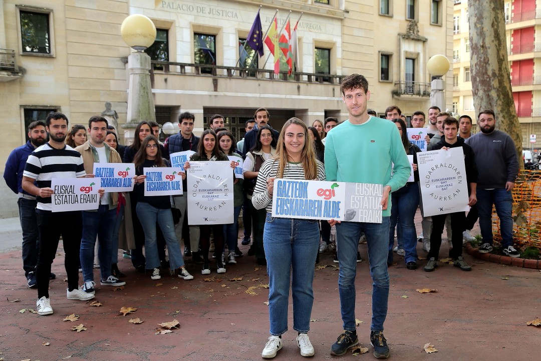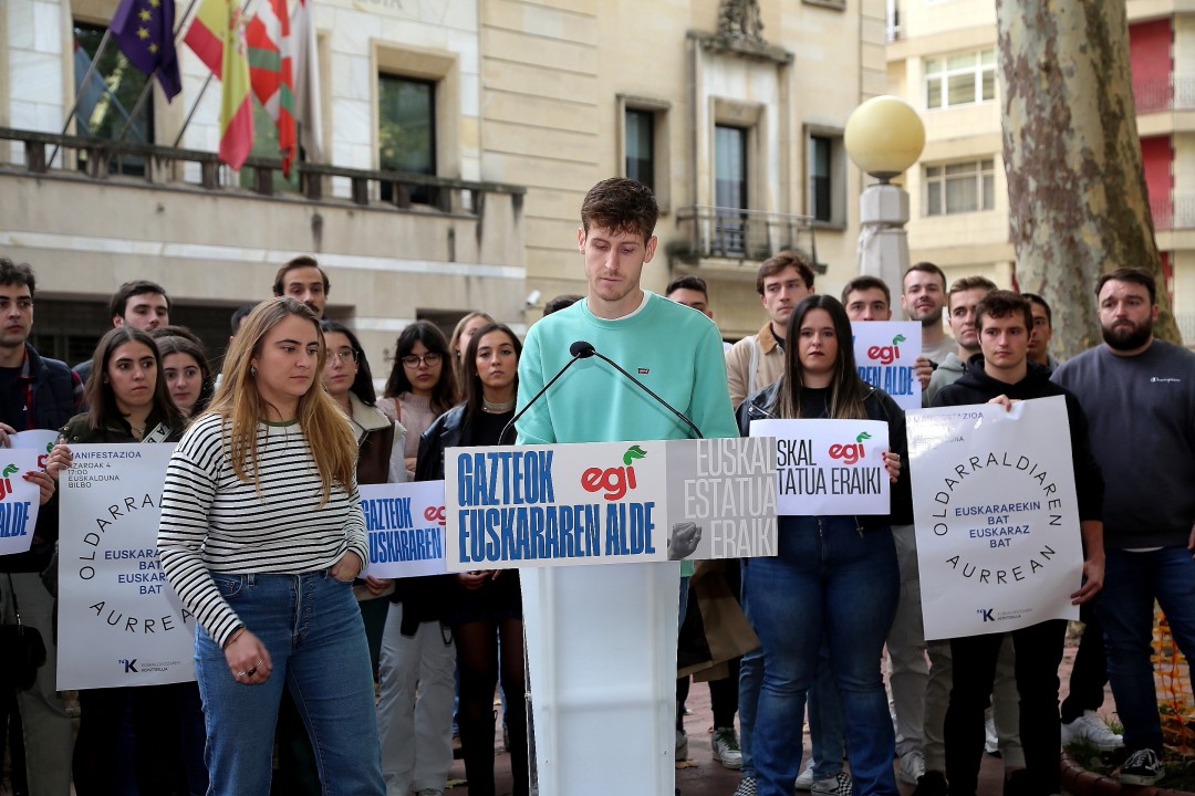 En el acto que ha tenido lugar frente al Palacio de Justicia de Bilbao, los egikides Olatz Arrese y Julen Antoñana han tomado la palabra acompañados por sesenta miembros de la organización juvenil. Han iniciado su intervención mostrando su solidaridad con los representantes públicos vascos que se han visto menospreciados o insultados por hablar en euskera en un acto público, lamentable episodio cuyo último protagonista ha sido esta misma semana el Lehendakari, Iñigo Urkullu, durante su intervención en el congreso de la Empresa Familiar.