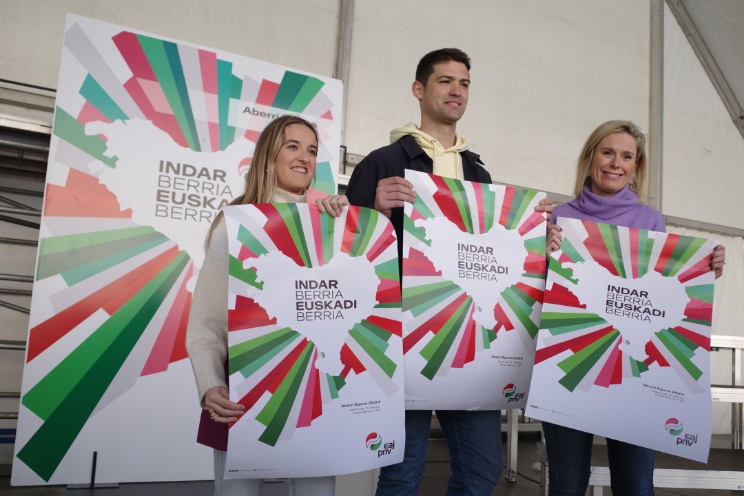 Mireia Zarate, secretaria del Euzkadi Buru Batzar; Joseba Díez Antxustegi, cabeza de lista de EAJ-PNV por Araba en las Elecciones Vascas del 21 de abril; y Bea Berlanga, secretaria del consejo nacional de EGI-Euzko Gaztedi, han presentado esta mañana el acto con que EAJ-PNV festejará el Aberri Eguna de 2024, que se celebrará este próximo domingo, 31 de marzo, a partir de las 11:30 horas en la Plaza Nueva de Bilbao. Bajo el lema ‘Indar Berria, Euskadi Berria’ (‘Nueva fuerza para la nueva Euskadi’), el Aberri Eguna alcanzará este año su 93ª edición, toda vez que el primer Día de la Patria vasca se celebró en 1932.