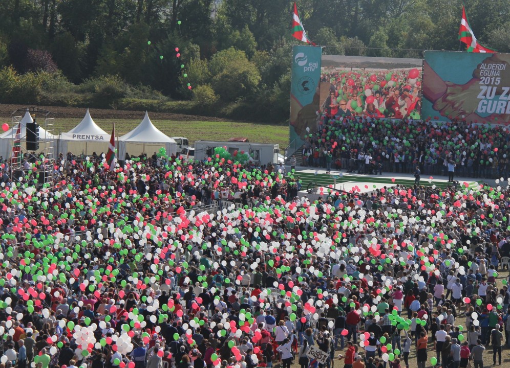 27Irailak Euzkadi Buru Batzarraren presidente Andoni Ortuzarrek, bere burua eskainiz, EAJ-PNVren buruzagi,herri kargudun,alderdikide eta alderdizaleak deitu ditu gaur, une honetan Euskadik bizi duen momentu erabakigarrian asmatzera. Ortuzarrek gogoratu duenez Euskadik nazio gisa aitortua izan nahi du eta estatus berria nahi du Espainiar estatuarekin duen harremanean, gaur egun krisi larrian dagoena. “Nazio gisa aitortuak izatea, Herri gisa ditugun eskubide politikoak eta Estatuarekiko aldebikotasun harremana nahi dugu besteen parean jar gaitzan, hori izango da hurrengo hilabeteotan egin beharreko lana”, esan du Ortuzarrek 2015eko Alderdi Eguneko diskurtsoan. Jeltzaleen jai nagusia Forondako (Araba) zelaietan ospatu da gaur milaka alderdikide eta alderdizaleren parte hartzearekin. Urkullu Lehendakariak,bere aldetik, euskal autogobernua Europaren markoan kokatzeko beharra azpimarratu du. Izan ere, “Zu zara gure indarra-Tú eres nuestra fuerza”, aurtengo Alderdi Eguneko goiburuak ere bilatzen du EAJ-PNVren alderdikide guztien balorea eta lana aitortzea, beraien ahaleginarekin lortu baita Sabino Aranak orain dela 120 urte sortu zuen alderdi politikoak, gaur egun, XXI. Mendean, bere historia osoan gizartean eta hauteskundeetan lortu duen onarpen eta babesik handiena izatea.