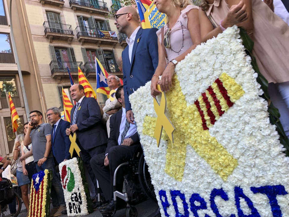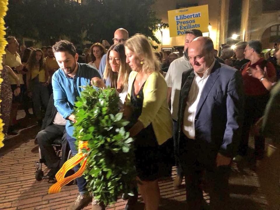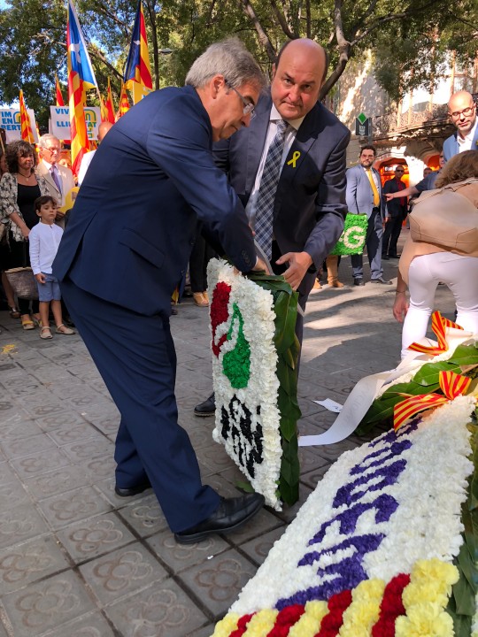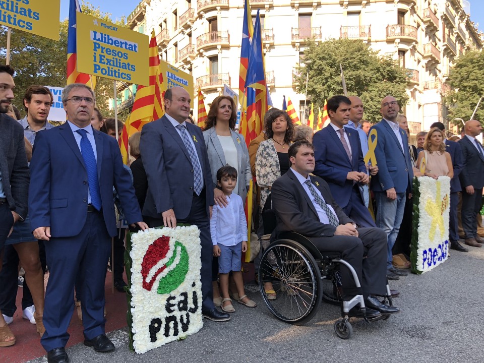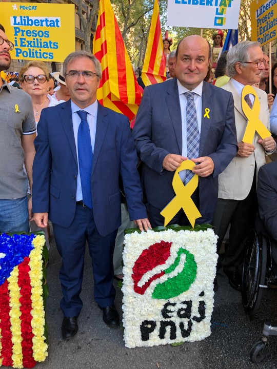 EAJ-PNVren Euzkadi Buru Batzarreko presidente Andoni Ortuzarrek “hizki handiz idatzitako politika” eta “baldintzarik gabeko elkarrizketa” eskatu ditu Kataluniako herriak une honetan bizi duen gatazka politikoa konpontzera begira. Konponbidea ez da etorriko “ez errepresiotik ezta judizializaziotik ere”, azken Diadatik hona urtean zehar izandako gertakariek erakutsi duten legez. Jeltzaleen buruak,halaber, elkartasunezko mezua bidali nahi izan die “procés-agatik espetxe zigorra sufritzen ari diren edo beren herria utzi behar izan duten pertsona guztiei”, eta guztientzat eskatu du epaiketa bidezkoa egitea, “aurreritzirik gabea”. Ortuzar Bartzelonan izan da, jeltzaleen ordezkaritzako buru gisa, Rafael Casanova 1714ko irailaren 11n hiriaren eta Kataluniako askatasunen defentsan hil zutenaren omenez egin den lore eskaintzan. Ordezkaritza jeltzaleko beste ordezkaria Joseba Aurrekoetxea Antolakuntzako burua izan da eta lore sorta bat utzi du Casanovaren irudiaren aurrean. Jeltzaleak PDeCATen ordezkarien ondoan egon dira, besteak beste David Bonvehí presidentearekin eta Artur Mas Kataluniako presidente ohiarekin. Talde berean izan da Juan Carlos Piñeiro Compromiso por Galicia taldeko idazkari nagusia. Ortuzar eta Aurrekoetxearen aurreikuspenen arabera, gaur arratsaldean Josep Rull, Jordi Turull eta Joaquim Forn bisitatuko dituzte gaur arratsaldean Lledoners-eko espetxean.