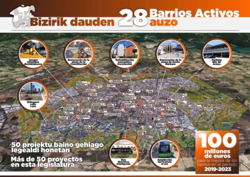 Era berean, ahalegina garrantzitsua izan da, Koroazio auzoko erabateko eta energia errehabilitazioa bezalako proiektuak aurrera ateratzeko, SmartEnCity europar proiektuaren eskutik, edo Aranako siloan parkinga eraikitzeko. Gainera, datorren legealdian gauzatu beharreko eta dagoeneko lizitatu diren inbertsioak ere badira, adibidez, Memorialaren inguruko lanak edo Espainiako Bankua edo Tornay Medikuaren kalea, besteak beste.