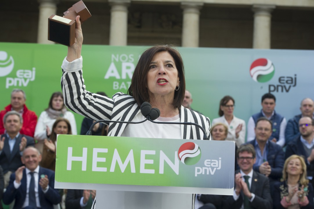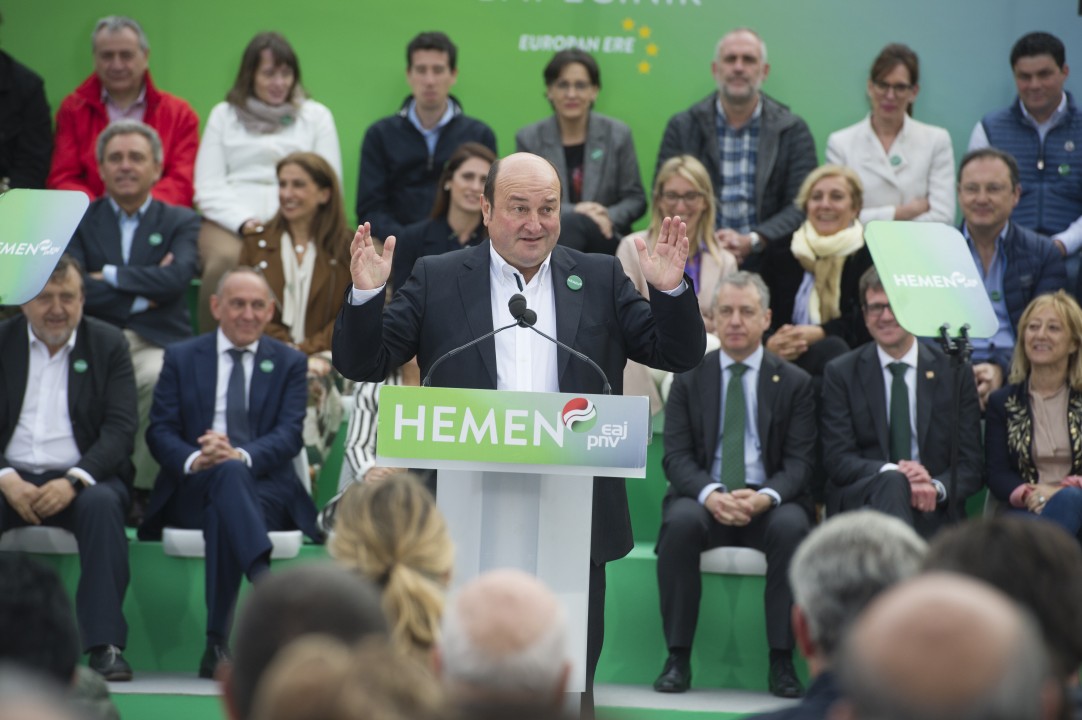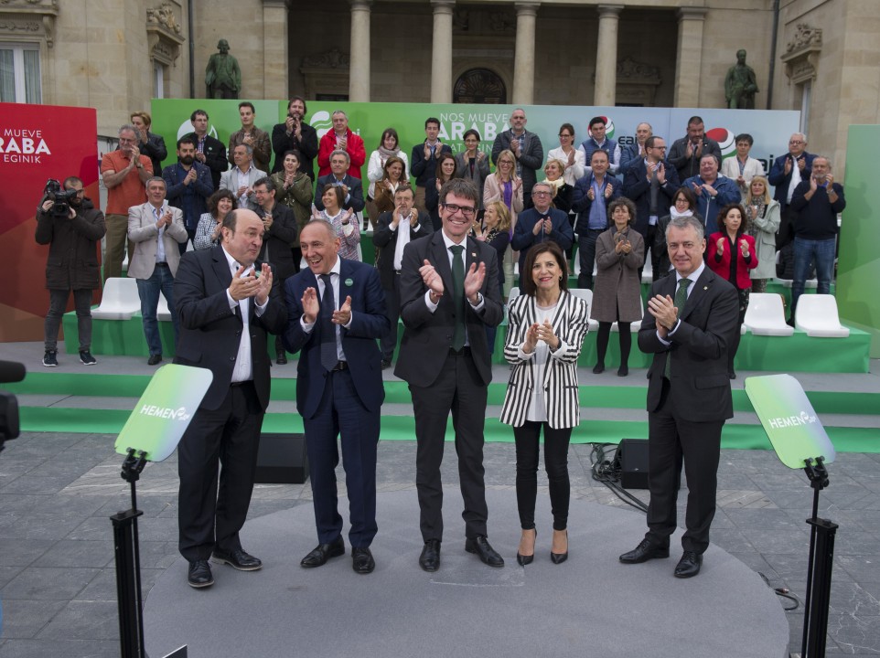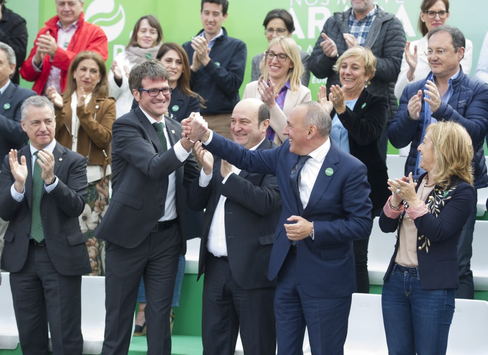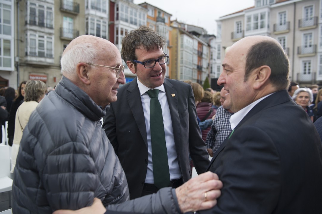 Euskadiko hiriburuan Probintzia Plazan egin den ekitaldian, EBBko presidenteak Larrión hautagaiaren metamorfosi faltsuaren kontra ohartarazi ditu herritarrak “Bildu zetaz jantzita ere, betiko Ezker Abertzalea da”