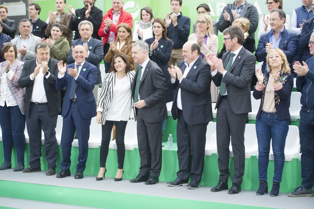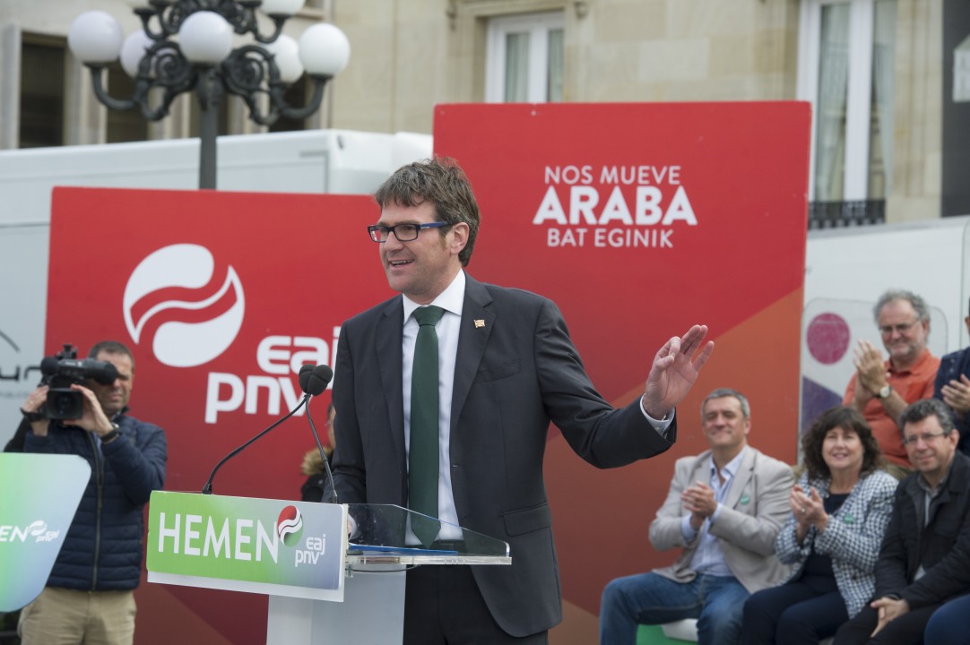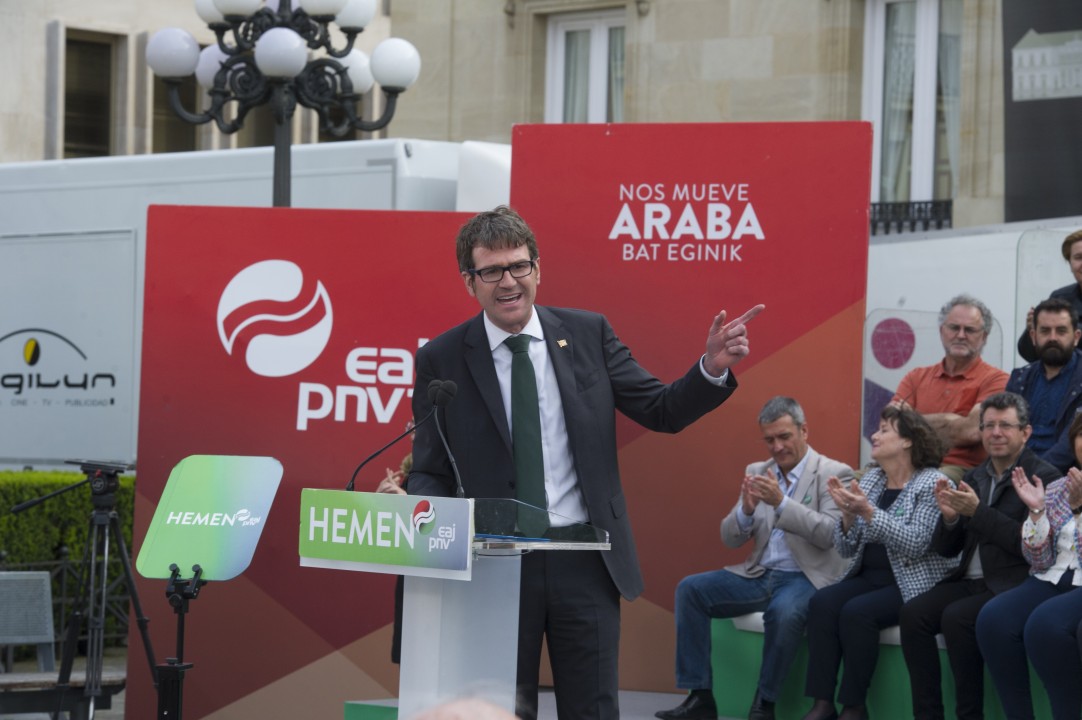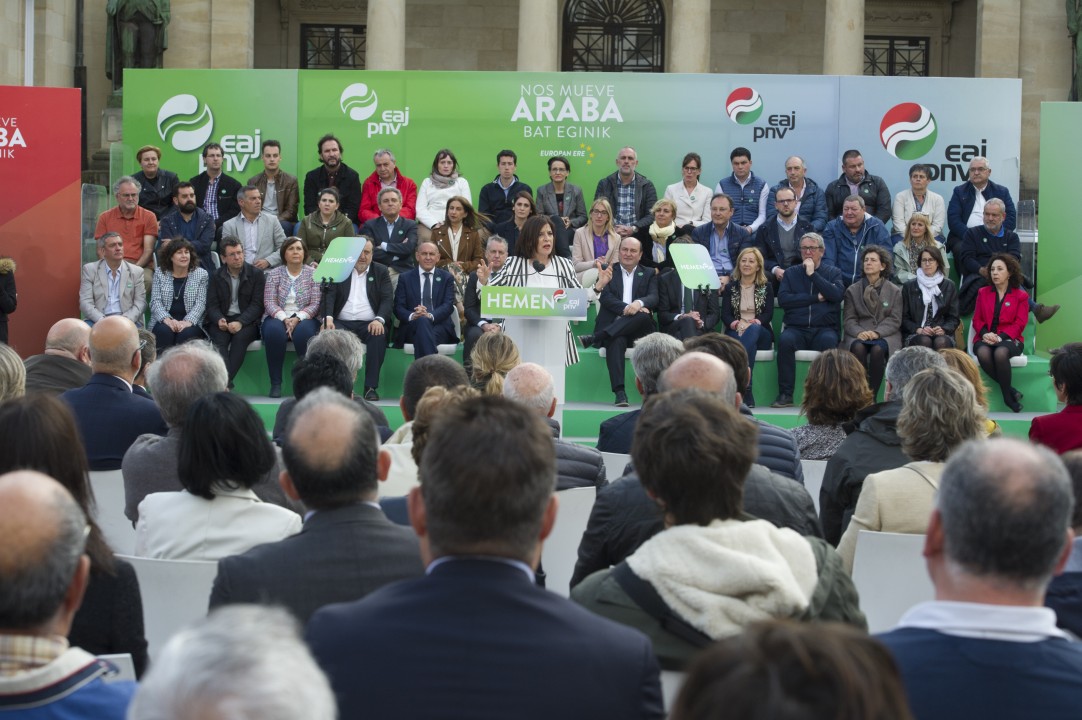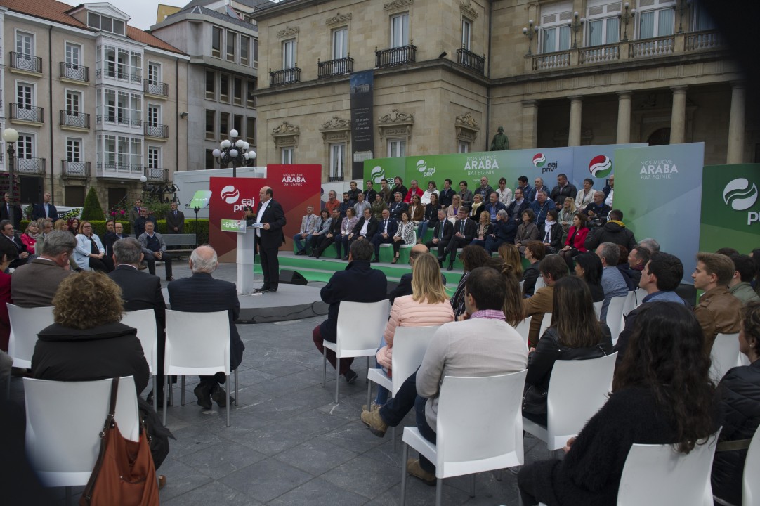 “EAJ osoa jarri da Gasteizen eta Araba osoaren zerbitzura. Hemen da Aitor Esteban, negoziaketetan Abiadura Handia lur azpitik iristea defendatu duena; hemen da Urkullu Lehendakaria, eta bere lidergopean Jaurlaritza, hiri honentzako proiektu garrantzitsuekin bat egin duena: tranbia, Bus Elektriko Adimenduna, Final Four, hiriburutasun kanona nabarmen igo izana, inbertsioak osasunean eta ikastetxe berrietan, zuntz optikoa Arabako herri guztietako industrialdeetara, ziber-segurtasuna,… EAJ osoa jarri da Gasteiz eta Arabaren zerbitzura. Eta gaur argi baino argiago adierazi nahi dut: EAJ osoak jarraituko du hiri honen eta herrialde honen zerbitzura”. Gardentasun osoz mintzatu da gaur Andoni Ortuzar Euzkadi Buru Batzarreko presidentea eta gardentasun berberarekin adierazi du EAJ-PNVk Euskadiko hiriburuarekin eta Araba Herrialdearekin hitzeman duen konpromisoa. Gaur egin du, EAJ-PNVk Gasteizko Probintzia Plazan egin duen ekitaldira hurreratu diren xxxxx pertsonen aurrean . Gainerako hizlariak izan dira Iñigo Urkullu Lehendakaria, Izaskun Bilbao Barandica Europako diputatu eta CEUS Europa Solidarioaren aldeko Koalizioko burua, Arabako ahaldun nagusi eta berrautaketara aurkezten den Ramiro Gonzalez eta Vitoria-Gasteizko alkate eta bigarren legealdirako aurkezten den hautagai Gorka Urtaran.
