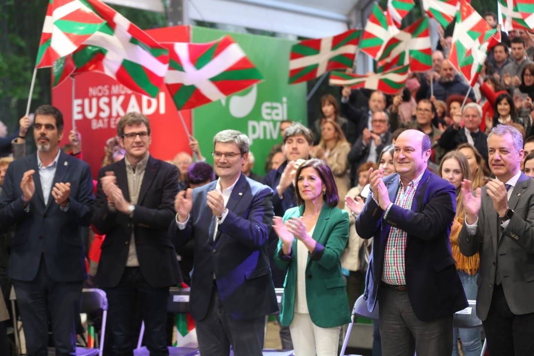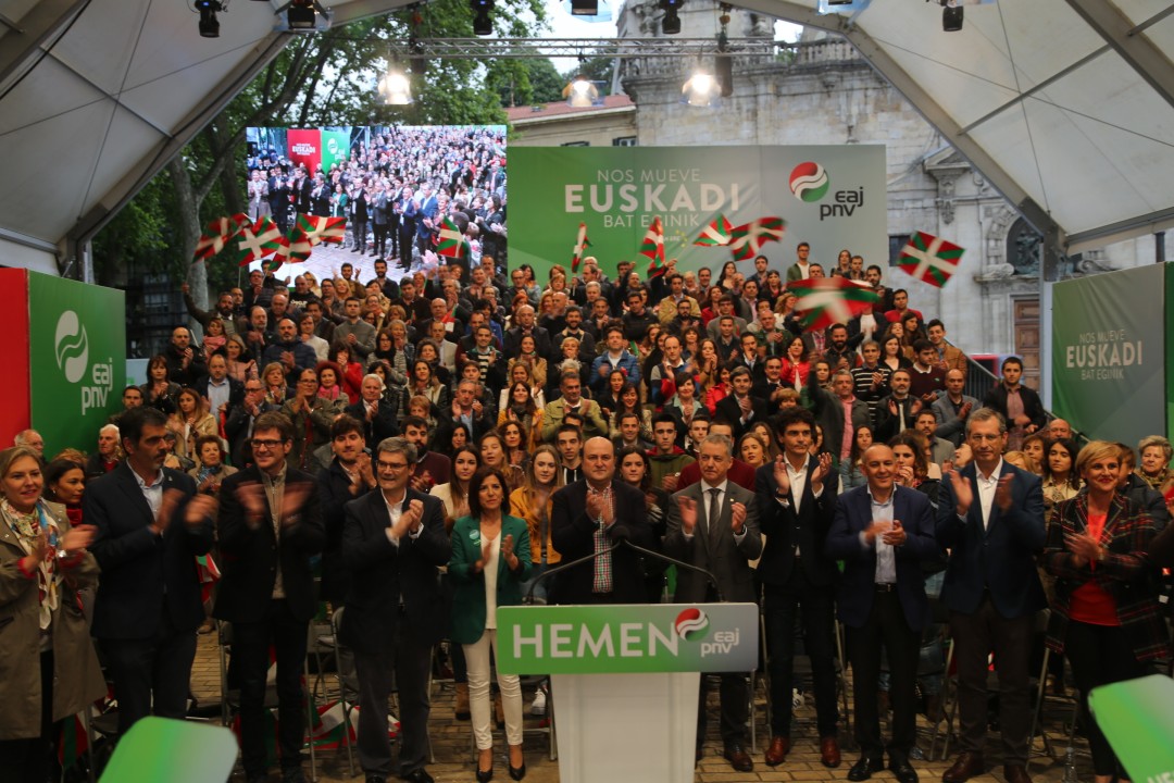 Bilboko Areatzan egin den ekitaldi hunkigarrian, 2.500 pertsona baino gehiagoren aurrean eta protagonista nagusia telebistako iragarkiko Ikurrina izan delarik, EAJ-PNVk gaur arratsaldean eman dio amaiera Udal eta Foru eta Europako Hauteskundeetarako kanpainari. “Uste dut igandean ere emaitza zoragarriak izango ditugula. Eta, zuei guztioi esker izango da” esan du Andoni Ortuzar Euzkadi Buru Batzarreko presidenteak. Mitin berean hitz egin dute Iñigo Urkullu Lehendakariak Europako Parlamenturako hautagai Izaskun Bilbaok eta EAEko hiru hiriburuetako alkategaiek eta foru ahaldunerako eta Europako Parlamenturako hautagaiek, Gorka Urtaran, Eneko Goia, Juan Mari Aburto, Ramiro González, Markel Olano eta Unai Rementeriak. Denek zabaldu nahi izan dute mezu berbera: euskal emakume eta gizonek, Euskadiko hiritargo osoak, igandean bozkatzera irten behar dute, iragan apirilaren 28an bezala, eta hautestontziak EAJ-PNVren botoekin bete behar dira “proiektuak errealitate bihur daitezen, Gasteizek eta Arabak, Donostiak eta Gipuzkoak , Iruñeak eta Nafarroak eta Bilbok eta Bizkaiak etorkizunerako urrats sendoak eman ditzaten”.