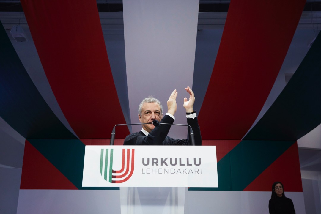 “Eusko Jaurlaritza indartsu dago, helburu argiak ditu eta garrantzizko gauzei begira dago. Sailburuak lanean buru belarri, atsedenik hartu gabe. Gure konpromisoa da, gure derrigorra ere bai. Dena ematen jarraituko dugu. Eta jakin dakit , aste konplikatu hauetan, emozioak arrazionaltasunaren gainetik jarri direla ikusirik, zera pentsatzen ari zaretela: ‘Zelan ote dago Lehendakaria?´. Iñigo indartsu dago. Betiko konpromisoarekin, betiko ilusioarekin Euskadi hobea eraikitzeko, gure bidetik jarraituz”. Mezu hunkigarri horrekin atera du Iñigo Urkulluk txalo zaparradarik handienetakoa, gaur eguerdian Vitoria-Gasteizko Europa Jauregian burrunba ikaragarria eragin duena EAJ-PNVk Eusko Legebiltzarrerako apirilaren 5eko hauteskundeetara eramango dituen zerrendak osatzen dituzten 75 pertsonak aurkezteko egin duen ekitaldian. 1.300 bat alderdikidek eta alderdizalek bete dute kongresu jauregia eta arretaz eta emozio osoz entzun dituzte Andoni Ortuzar Euzkadi Buru Batzarreko presidentearen eta Leixuri Arrizabalaga, Bakartxo Tejeria eta Urkullu, hurrenez hurren Bizkaia, Gipuzkoa eta Arabako zerrendaburuen hitzak. Ekitaldiko elementu nagusia Ikurrina erraldoi bat izan da eta hormatik atera da hautagai jeltzaleak “besarkatuz”.
