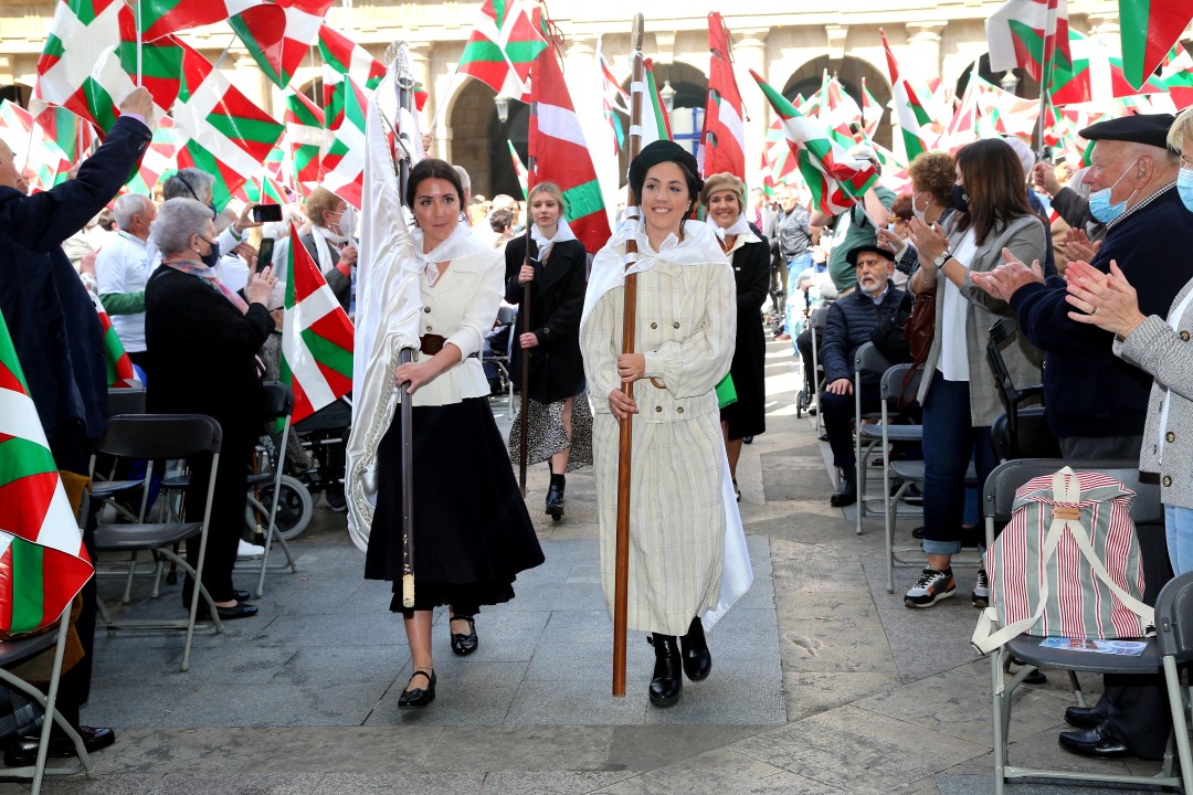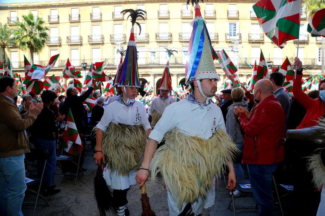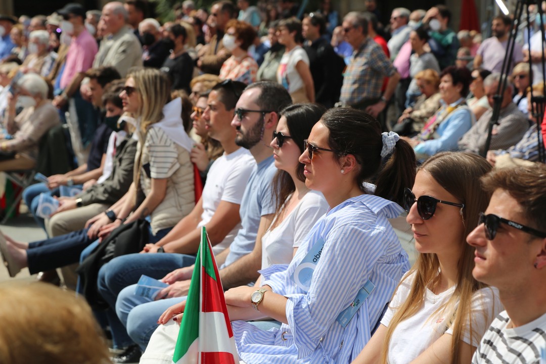 Euzkadi Buru Batzarraren presidenteak eta Iñigo Urkullu Lehendakariak hitz egin dute gaur, bi urte geroago, Bilboko Plaza Barria berriz ere txiki utzi duten 3.000tik gora pertsonaren aurrean, EAJ-PNVk Aberri Eguna ospatzeko egin duen ekitaldian