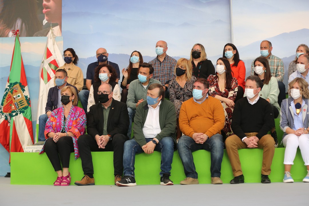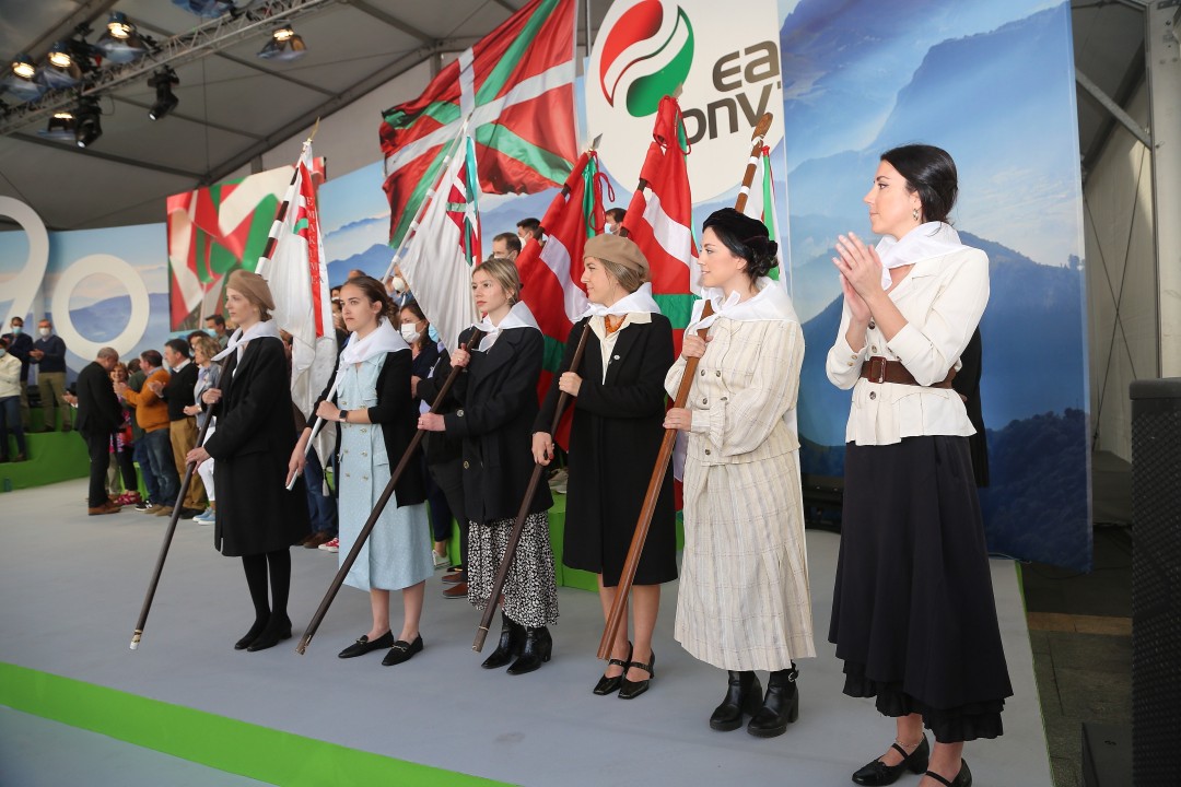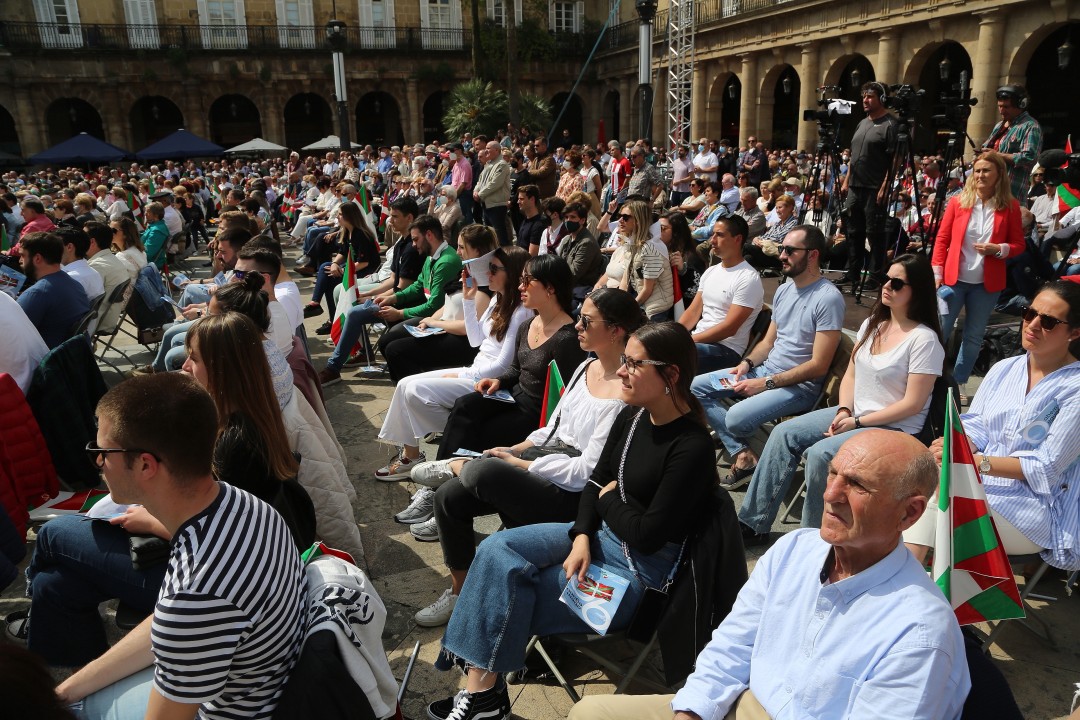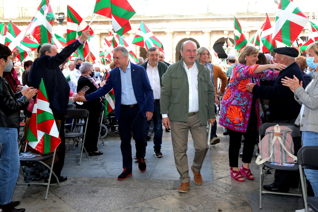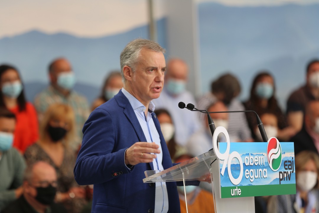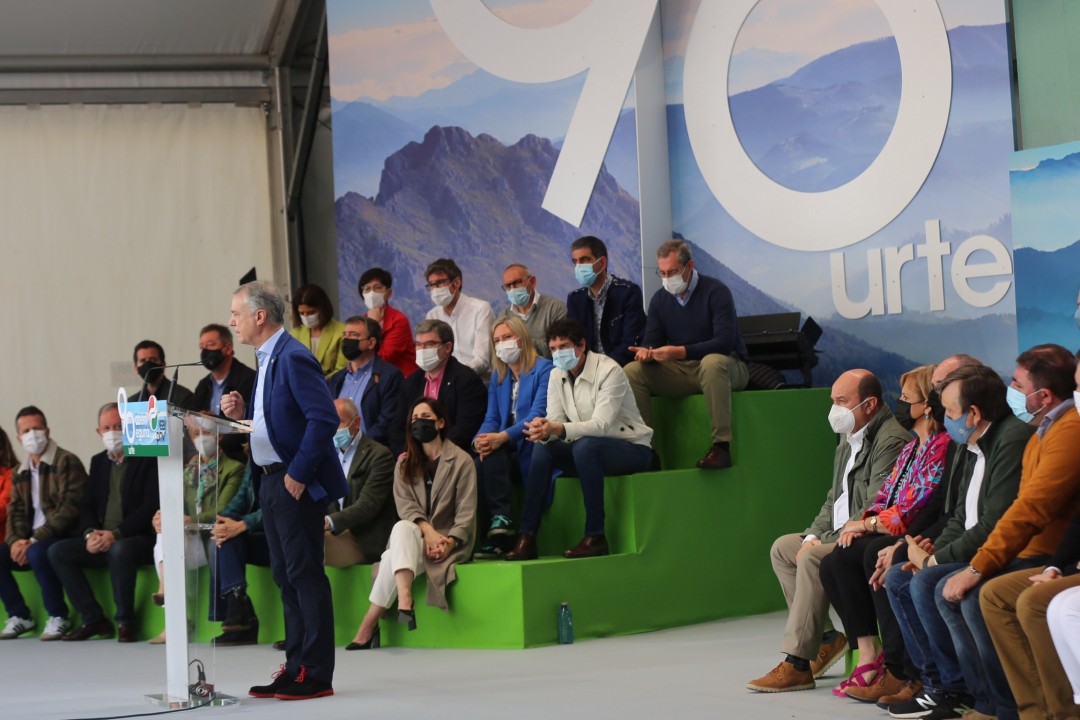 Horixe izan da Euzkadi Buru Batzarraren presidente Andoni Ortuzarrek gaur , pandemiak derrigortuta halako ekitaldiak egiterik egon ez diren urte biren buruan, Bilboko Plaza Barria txiki utzi duten EAJko alderdikide eta alderdizaleen aurrean zabaldu nahi izan duen mezu nagusia. EAJk jendetza batu du gaur Aberri Eguna ospatzeko, aurtengoa 90. edizioa izan delarik. Ortuzarrek hitza hartu baino lehen, Plaza Barriko ekitaldi politikoan hitz egin du Iñigo Urkullu Lehendakariak, eta baieztatu du Euskadi, berriz ere, egungo egoera ekonomiko zailetik aterako dela, baina ez duela egingo ez utopietan oinarrituta ezta sasi-paradisuko ereduetan oinarrituta ere. “Zerga gutxiago da zerbitzu publiko gutxiago, osasun gutxiago, hezkuntza gutxiago eta babes sozial gutxiago. Ez da gure eredua. Gure eredua da lana, esfortzua, kudeaketa zintzo eta arduratsua, oinak lurrean jarrita. Gure konpromiso sozial eta humanista da Euskadik izan dezala ahalik eta gizarte kohesiorik handiena. Gure lehentasuna da elkarrekin aurrera egitea, ahalik eta urrunen hel gaitezen”, baieztatu du Urkulluk.