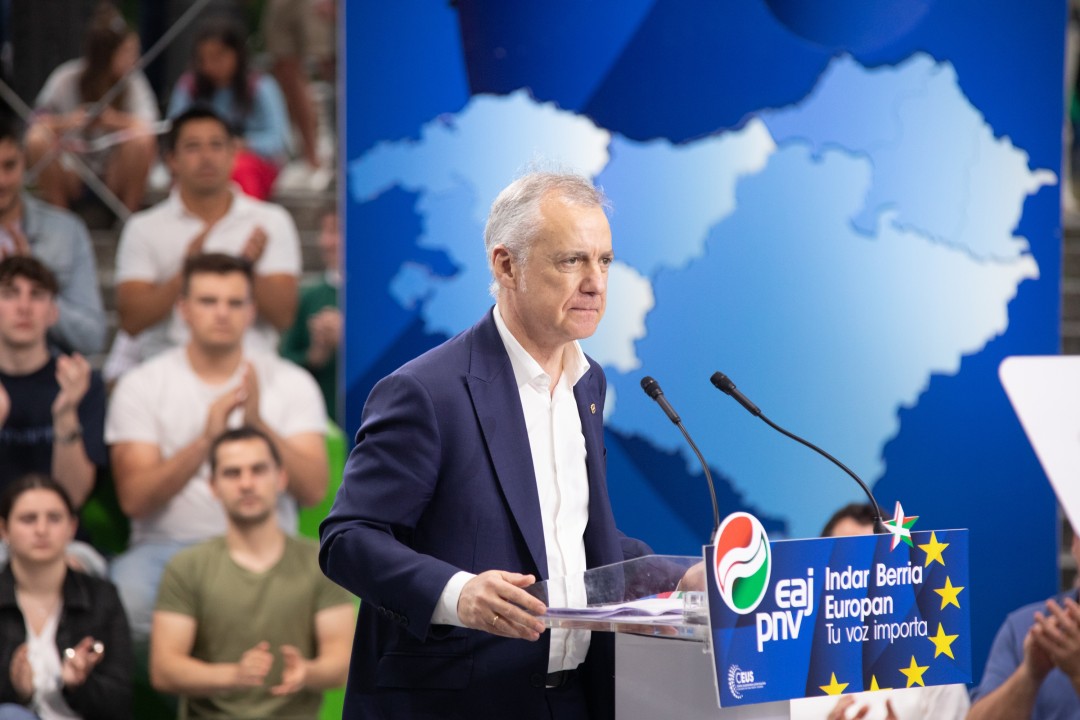 Europako Ganberako eserlekua berriz lortzeko helburuarekin eta zazpi Herrialdeetan parte hartuko duen alderdi bakarra izateaz harro, EAJ-PNVk gaur eman dio amaiera igande honetan, ekainaren 9an, egingo diren Europako Hauteskundeetarako kanpaina. Alderdikide eta alderdizale ugari bertan izan direla, alderdi jeltzalearen azken ekitaldiak hainbat hizlari izan ditu, zortzik hartu baitute hitza. Bakoitzak, atrilera hurbiltzean, puzzle baten pieza bat jarri du, non azken piezarekin zazpi Herrialdeak, EAJ-PNVren eta CEUS Koalizioaren logoak eta Ikurrina Europar Batasunaren izar horiekin ikusten baitziren. Sinbolismoz beteriko keinu honi ahotsa jarri nahi izan dio Andoni Ortuzar Euzkadi Buru Batzarraren presidenteak. “Astelehenean, ekainak 3, Sabino Aranak Larrazabalen Zinaren urteurrena bete zen. 131 urte geroago, Sabino oso pozik egongo zen bere alderdia, EAJ, euskal lurralde guztietan aurkezten den alderdi bakarra dela ikustean”, adierazi du buru abertzaleak. Ortuzarrez gain, Iñigo Urkullu lehendakariak, Oihane Agirregoitia zerrendaburu jeltzaleak, Aitana Agirre, Rakel Molina, Amaia Arrizabalaga eta Gracianne Mirande hautagaiek eta Izaskun Bilbao Barandica eurodiputatuak hartu dute hitza.