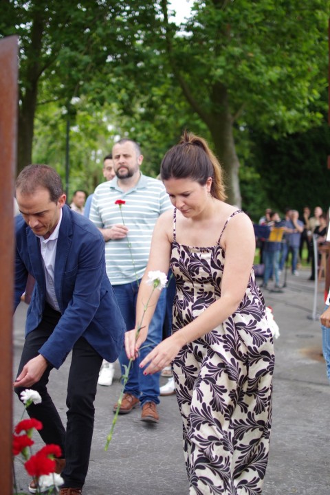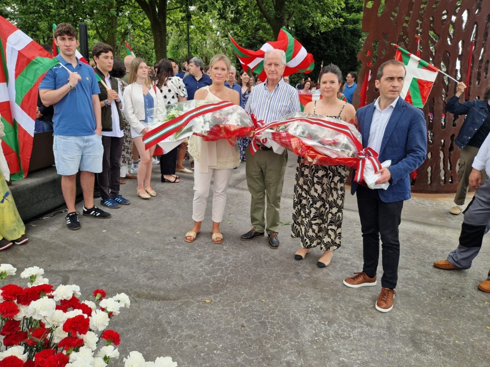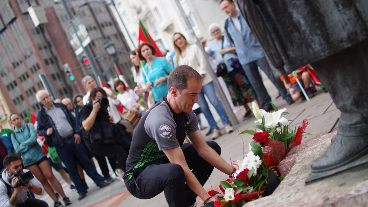 Dozenaka alderdikide elkartu dira Bilbon, Lehendakariaren eskulturaren ondoan, lore eskaintza batekin hari omenaldia egiteko, faxismoaren kontra eta demokraziaren eta askatasunaren alde Guda Zibilean borrokatu ziren gudari, miliziano eta emakumeak gogoratuz Artxandarako herri igoera hasi baino lehen